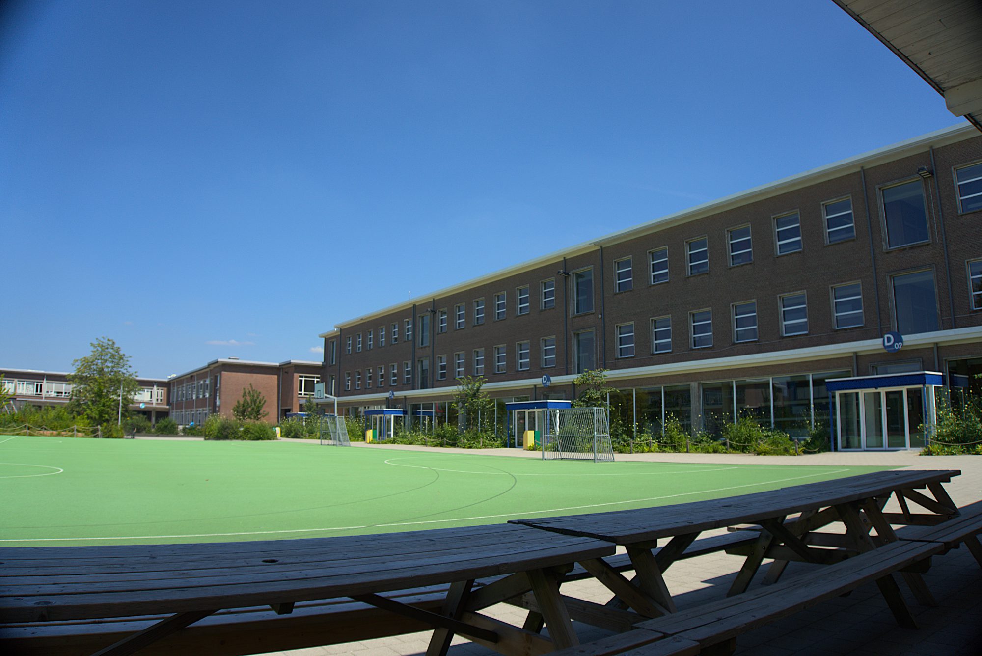 Op het schoolplein is volop ingezet op vergroening. Er werd een diverse beplanting aangelegd met bloeiende planten, struiken, klimplanten en bomen, waardoor leerlingen de seizoenen kunnen beleven via kleur, geur en smaak. Er is bewust gekozen voor inheemse, robuuste soorten die tegen een stootje kunnen, zodat het groen speelbestendig is.